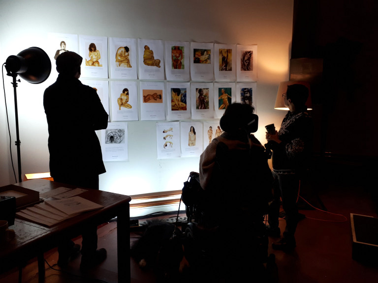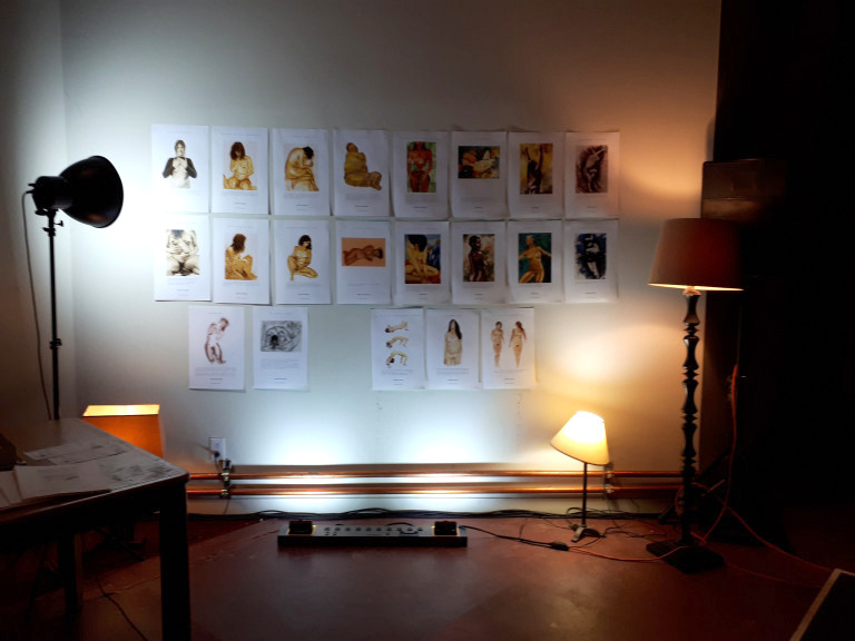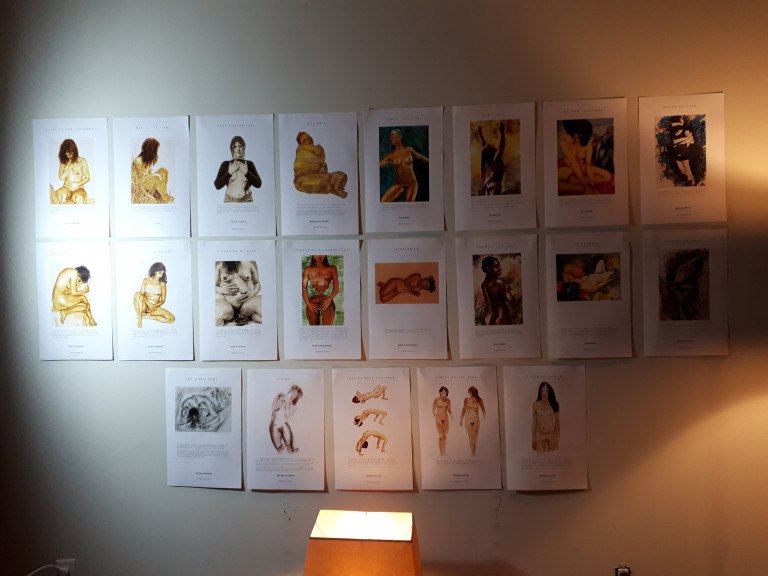 Nous avons commencé l’atelier en expliquant comment nous avons été touchées par les pratiques de la photographie du corps nu et le dessin fait à partir de ces images. Des images de corps au naturel, souvent prises dans la nature, sans poses préconçues et sans recherche de résultat autre que se permettre d’être vu et de voir le corps tel qu’il l’est.