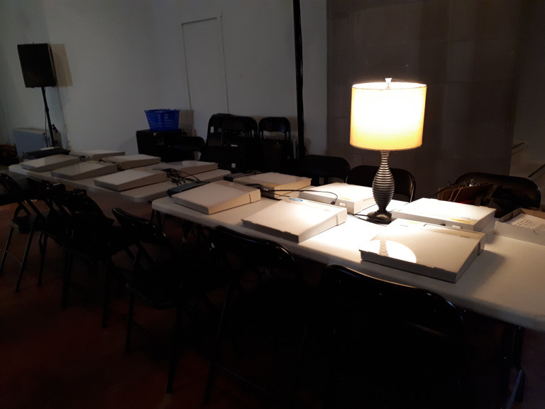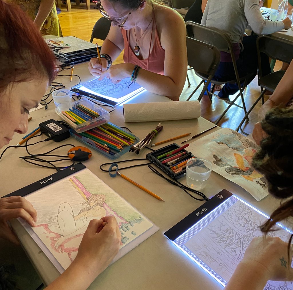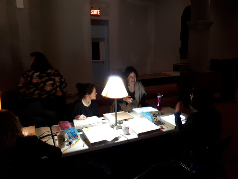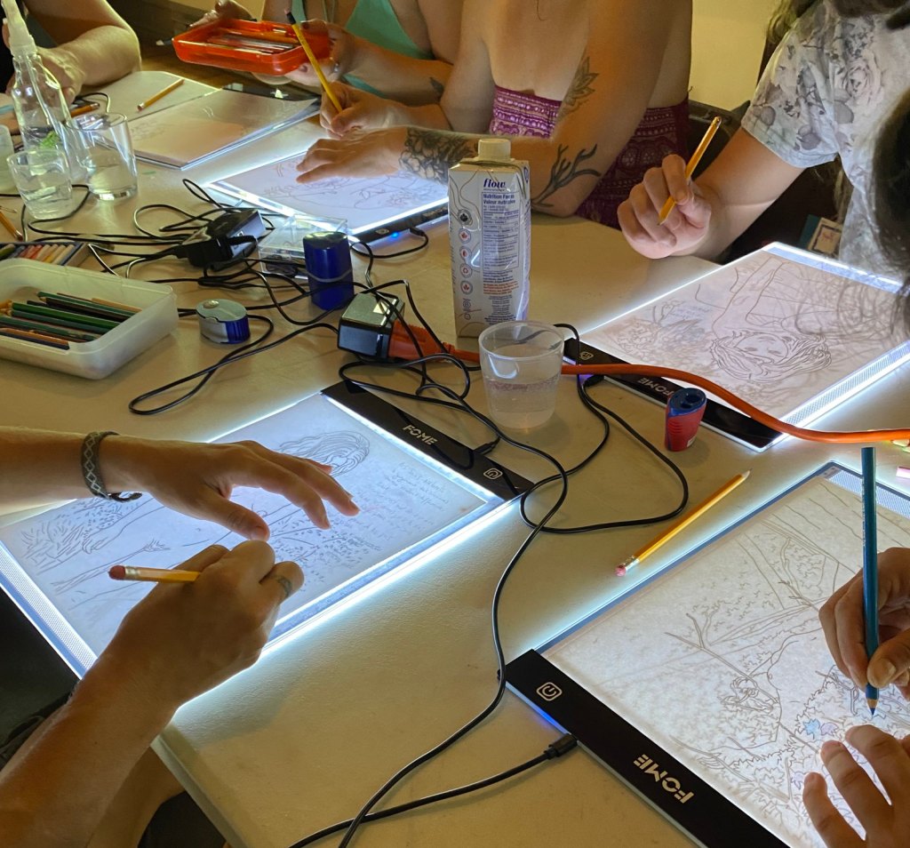 Les animatrices Colette, Émilie et Audrey ont témoigné de leurs expériences avec la photo et le dessin et ensuite nous nous sommes installés autour des tables devant des petites plaques lumineuses qui permettent de tracer les modèles (dessins-silhouettes fait à partir des photos). Le traçage enlève toute obligation de performance tout en offrant un regard contemplatif sur le corps dans la nature.
