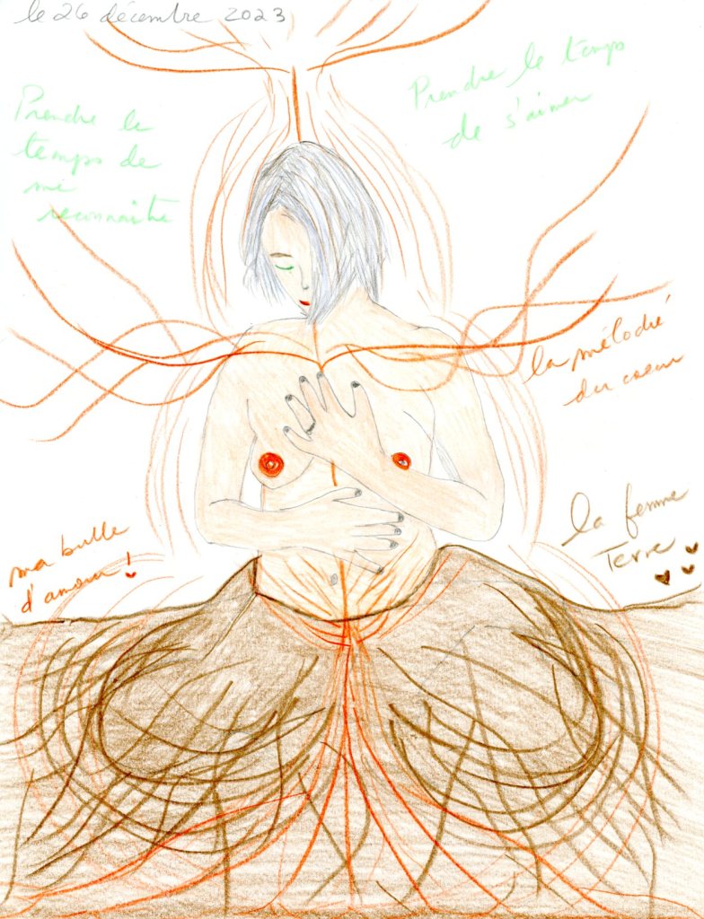 Prendre le temps de m’aimer. Prendre le temps de me reconnaître. Je retrouve ma bulle d’amour. La mélodie du cœur émane. La femme Terre émerge !