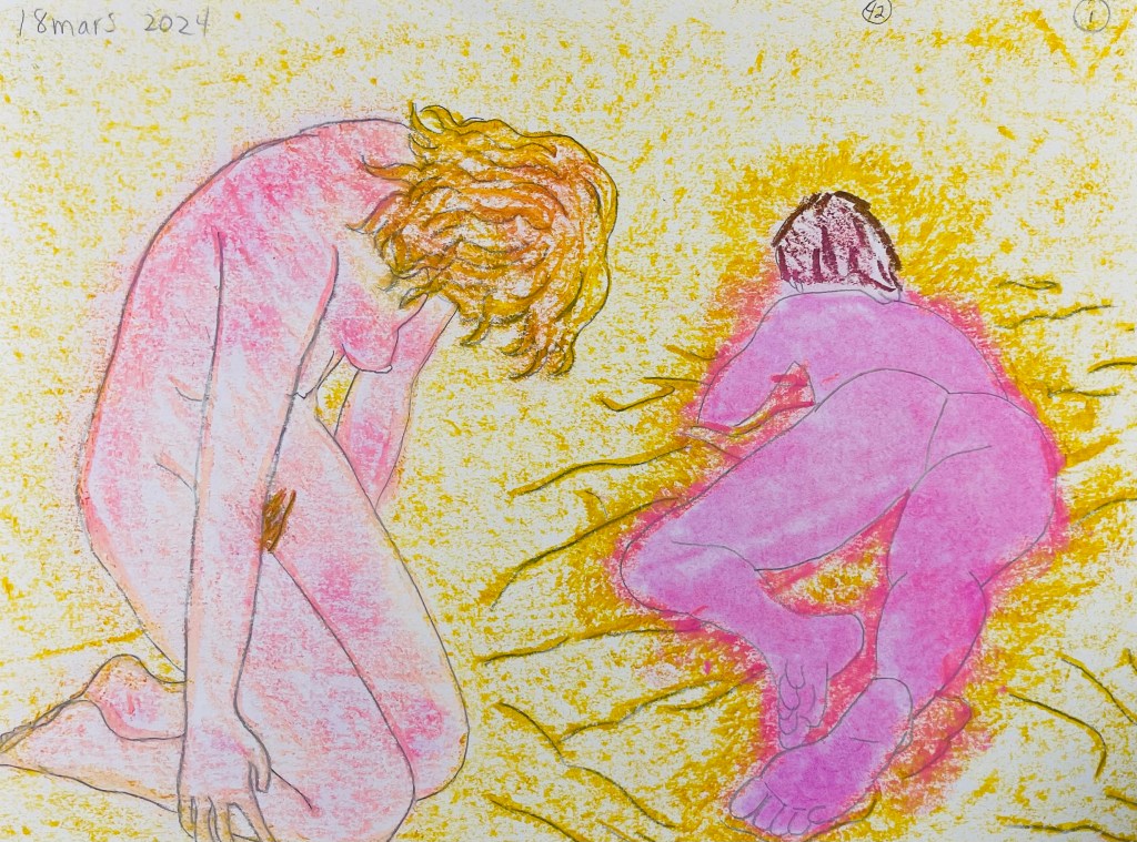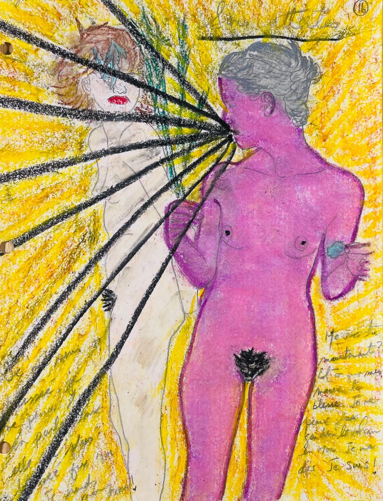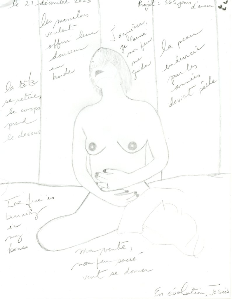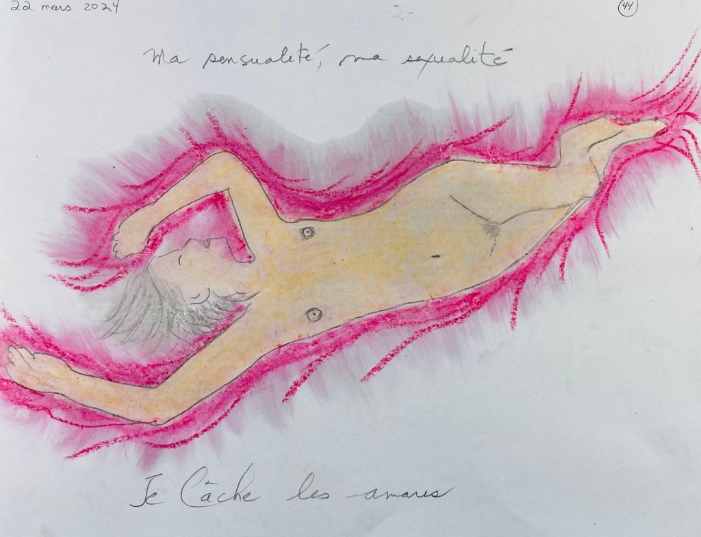 Ça fait dur ! J’ai de la difficulté à tracer les seins. Je ne vois pas le contour, c’est important pour moi de bien tracer la forme de mes seins. La beauté, la vraie beauté naturelle de mes seins, je veux la voir sur le papier. Je tiens à ce que ce soit juste.