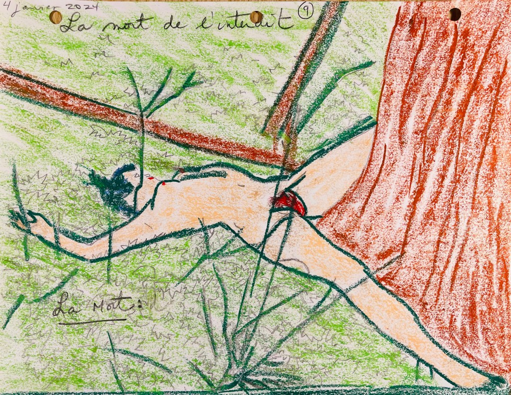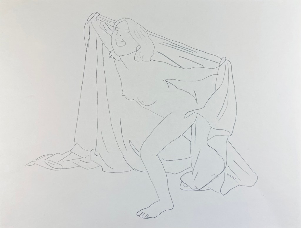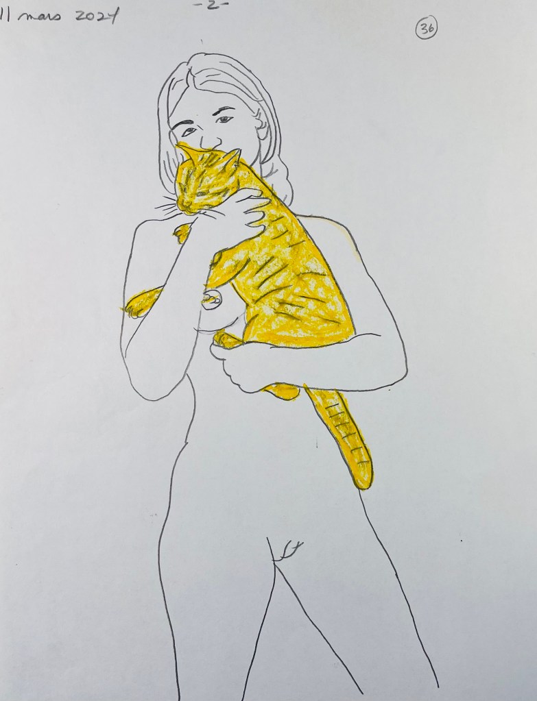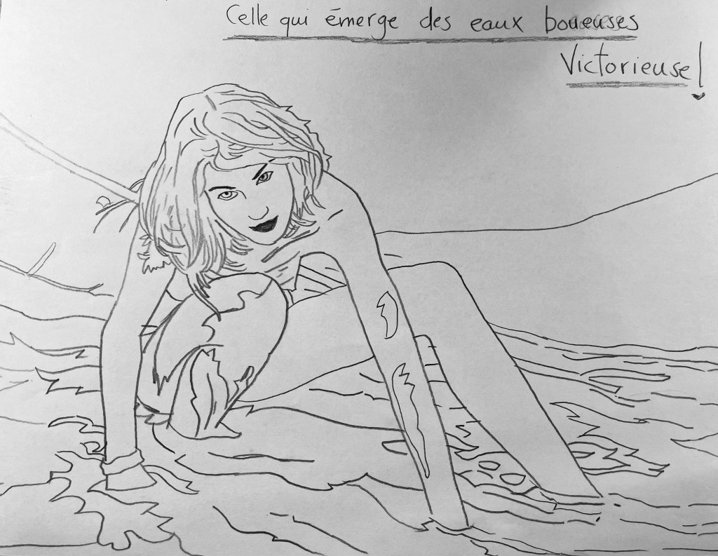 Ça fait dur ! J’ai de la difficulté à tracer les seins. Je ne vois pas le contour, c’est important pour moi de bien tracer la forme de mes seins. La beauté, la vraie beauté naturelle de mes seins, je veux la voir sur le papier. Je tiens à ce que ce soit juste.
