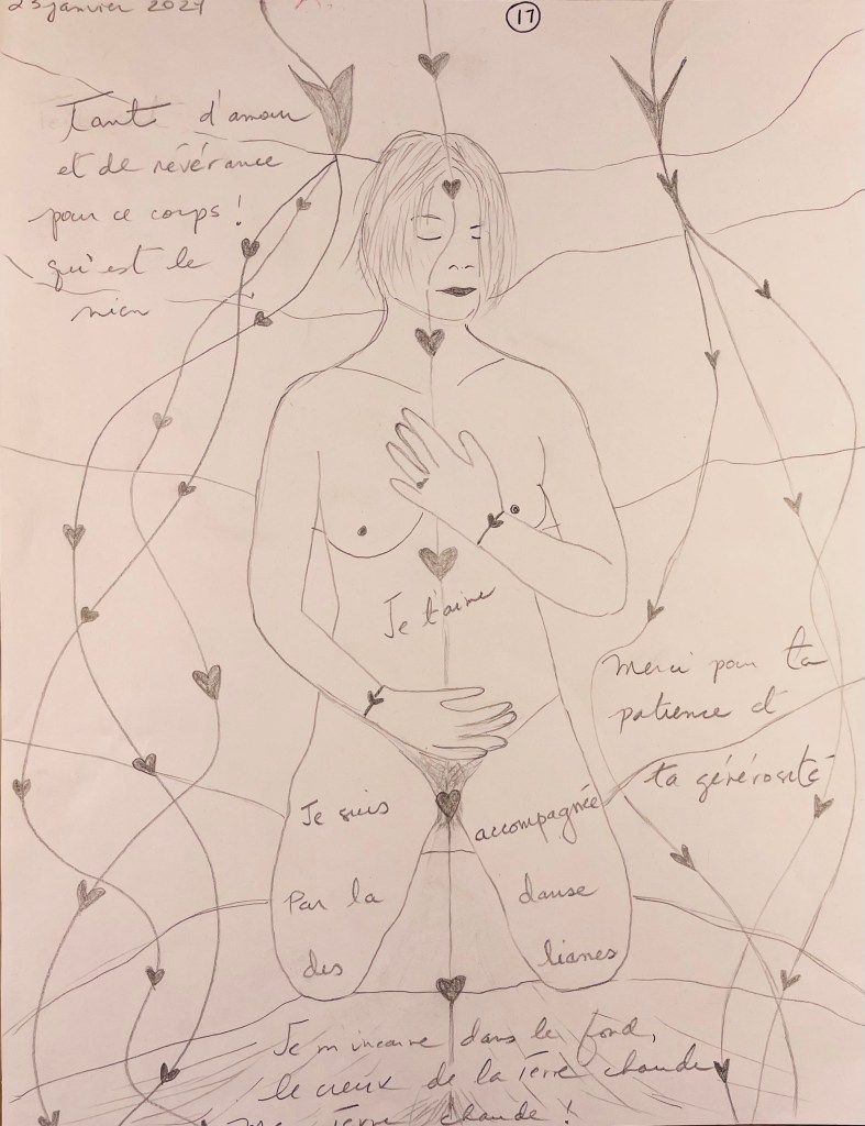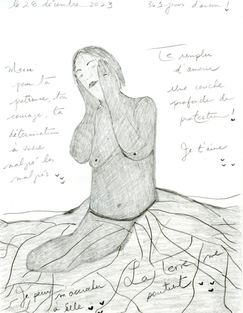 Et pour 2024, qu’est-ce qui m’appelle : je m’enracine, je trace, je dessine, je prends le temps, je m’offre de la douceur, de la tendresse, de l’amour. Je fais fructifier toutes les graines que j’ai plantées au fil des ans. J’offre ma médecine!
