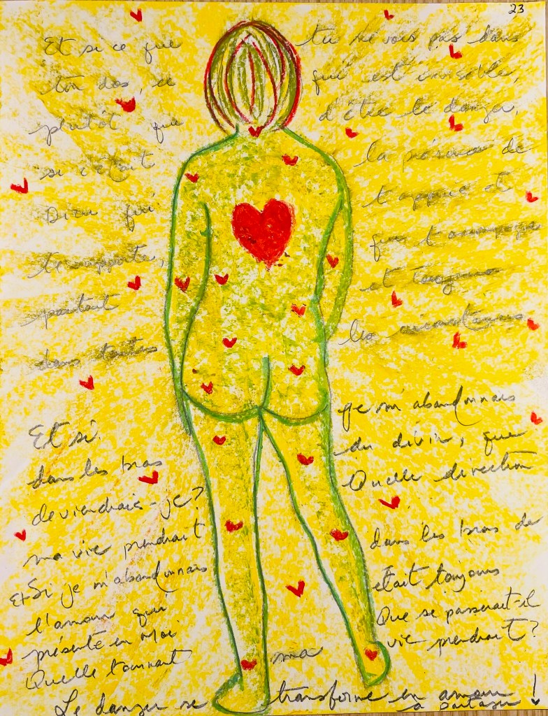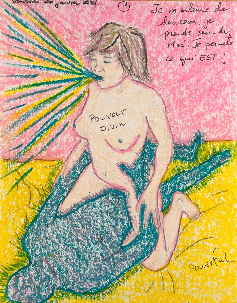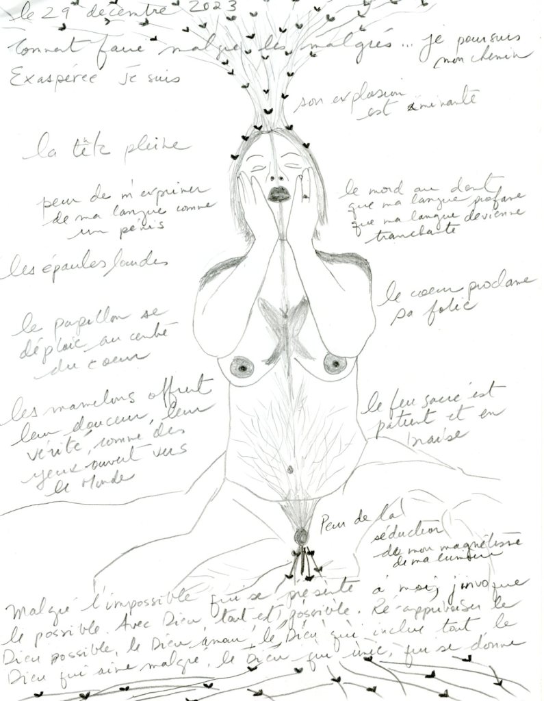 « Comment faire malgré tout… je poursuis mon chemin. » Exaspérée, je suis. La tête pleine, les épaules lourdes, le mors aux dents. J’ai peur de m’exprimer, que ma langue devienne tranchante comme un pénis qui s’insère sans être invité. Le papillon se déploie au centre de mon cœur, mon cœur proclame ses folies, mes mamelons offrent leur douceur, leur vérité, comme des yeux ouverts vers le monde. Mon feu sacré est patient et en braise. J’ai peur de la séduction, de mon magnétisme, de ma lumière. Malgré l’impossible qui se présente à moi, j’invoque le possible. Avec Dieu, tout est possible. Je réapprivoise le dieu possible, le Dieu Amour, le dieu qui inclut tout, le dieu qui aime malgré, le dieu qui unit, qui se donne. Je comprends qu’en guérissant le féminin, la peur de la séduction, du magnétisme et de la convoitise, le masculin pourra s’exprimer à travers moi. Je reprends mon pouvoir de femme, je reprends ce qui m’appartient, j’inclus tout en moi sans couper, sans diviser, sans juger, sans rendre bon ou mauvais.