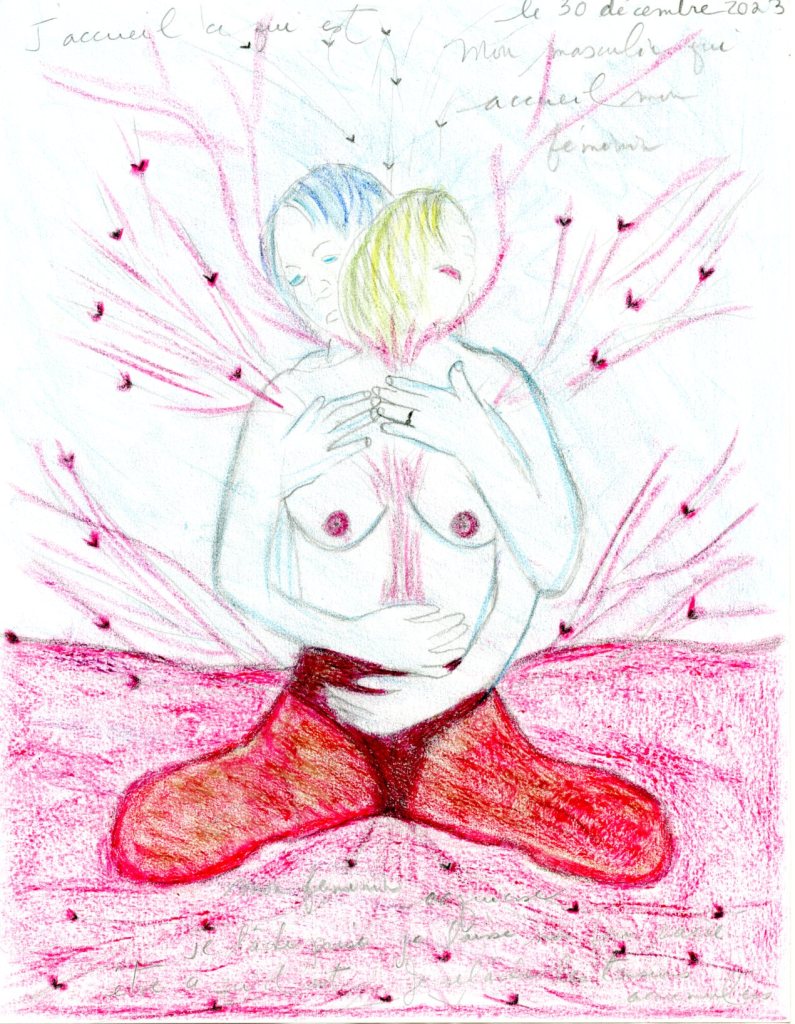 Mon masculin accueille mon féminin. J’accueille ce qui est, mon féminin acquiesce, je lâche prise, je laisse mon féminin sacré être ce qu’il est, je relâche toutes les tensions accumulées.