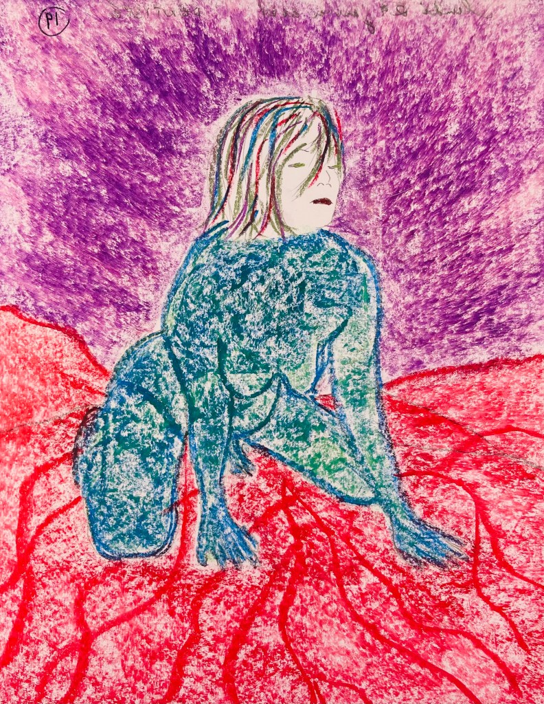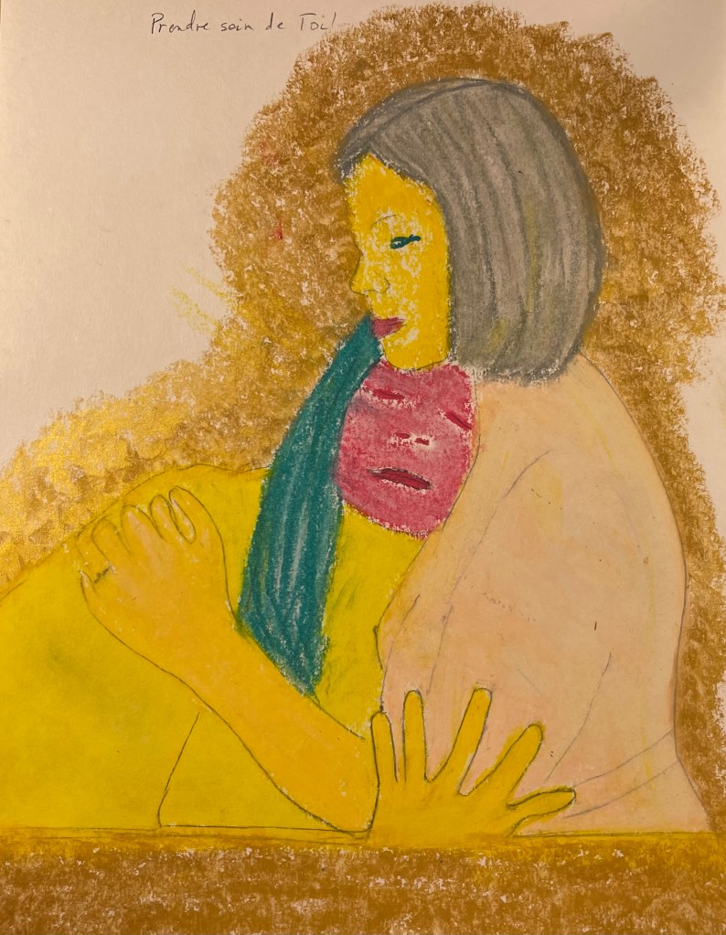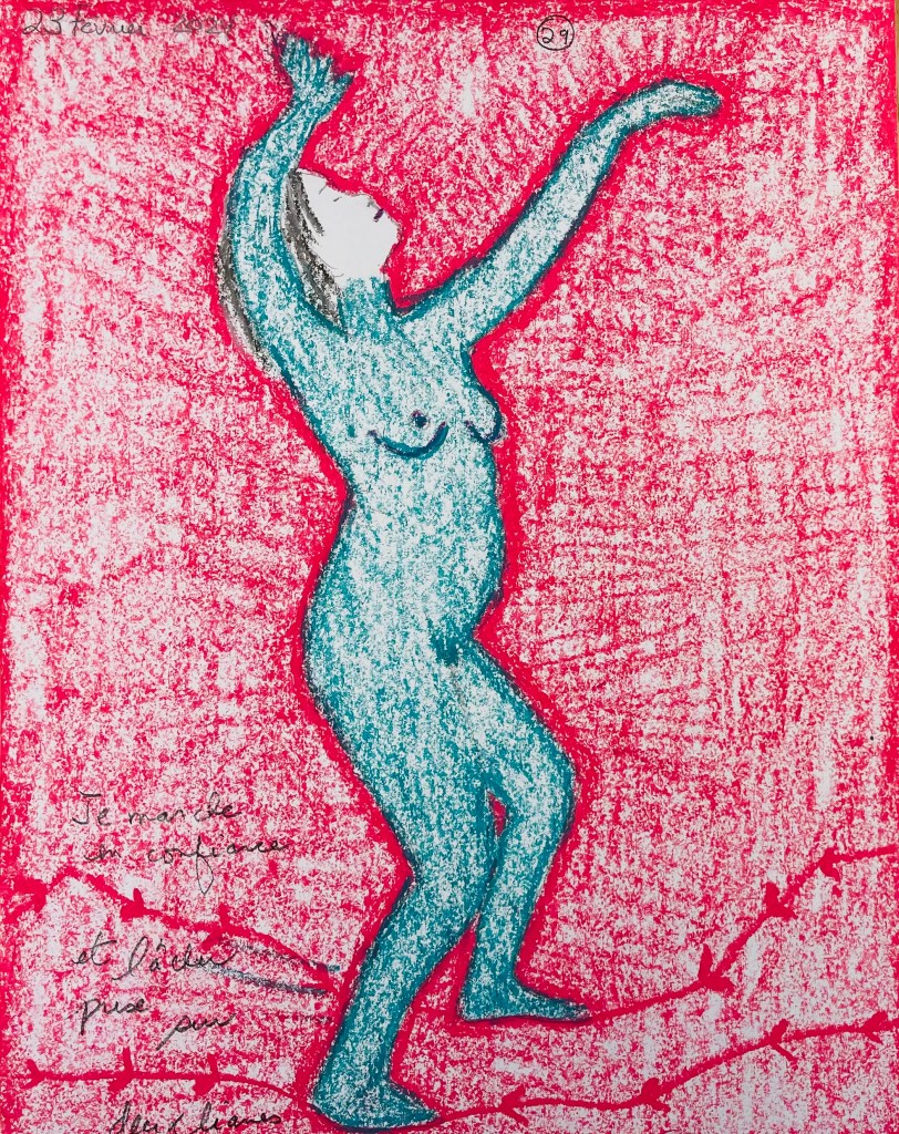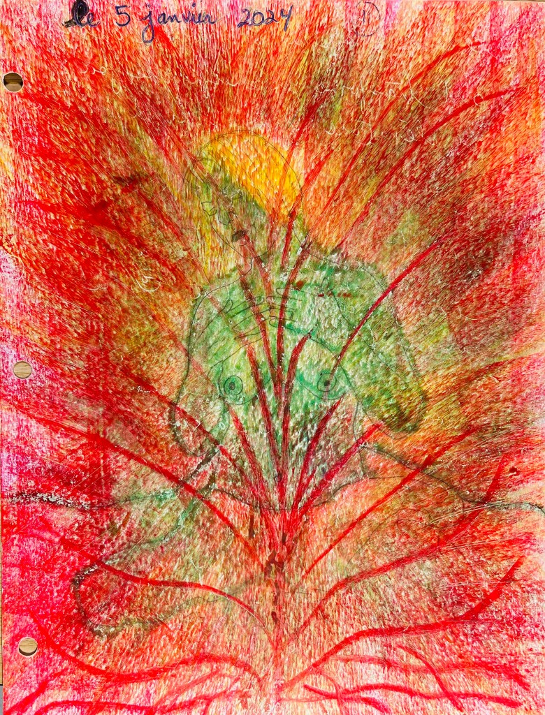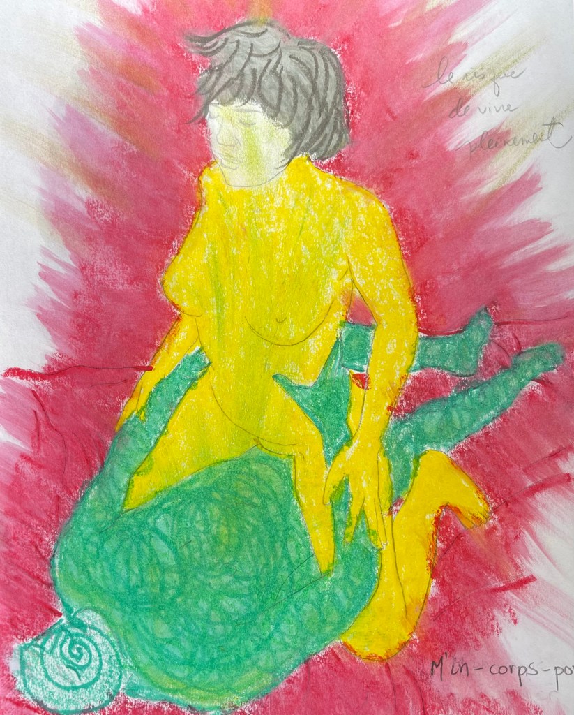 J’ai un grand désir de m’émanciper, d’ouvrir, de me libérer, de m’exprimer. Je suis intimement lié à la terre et au ciel, grandement appuyé tout autour. La vie déborde en moi de façon très généreuse. Le jaune de ma gorge, le jaune du ciel. Mes jambes bleues remplies de force me mènent à bon port. Mon cœur est joyeusement rempli d’amour et de tendresse à partager. Je ressens un blocage au niveau du sexe, des seins et de la gorge. Je me mets à rire quand j’exprime que j’ai besoin d’un exorcisme. Mes charges me protègent : « Non, on ne va pas là ». J’ai tout en moi et autour de moi. Je m’ouvre à l’inconnu, j’accepte que j’ai peur de celui-ci. Je l’embrasse malgré l’inconfort. Je fais confiance à mon chemin. Mon chemin de vie.