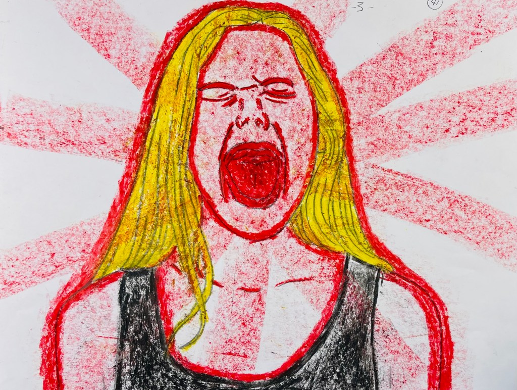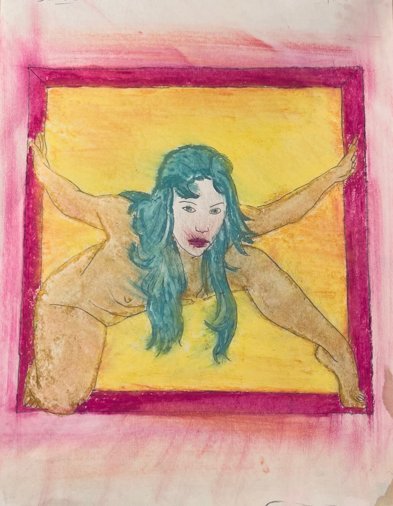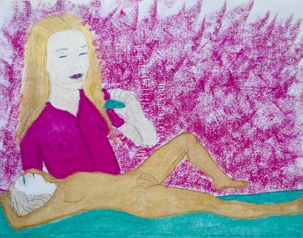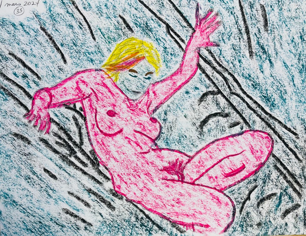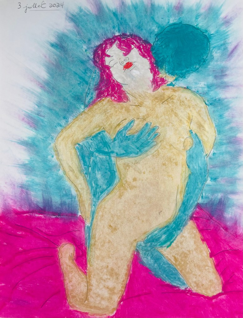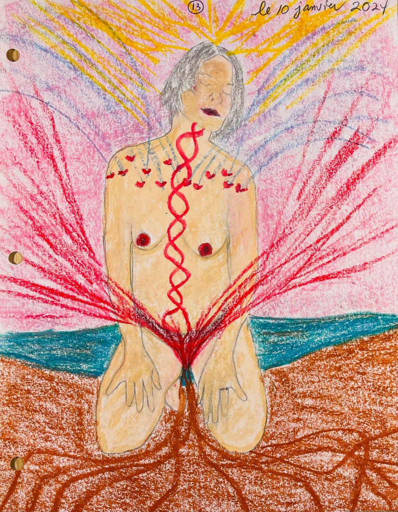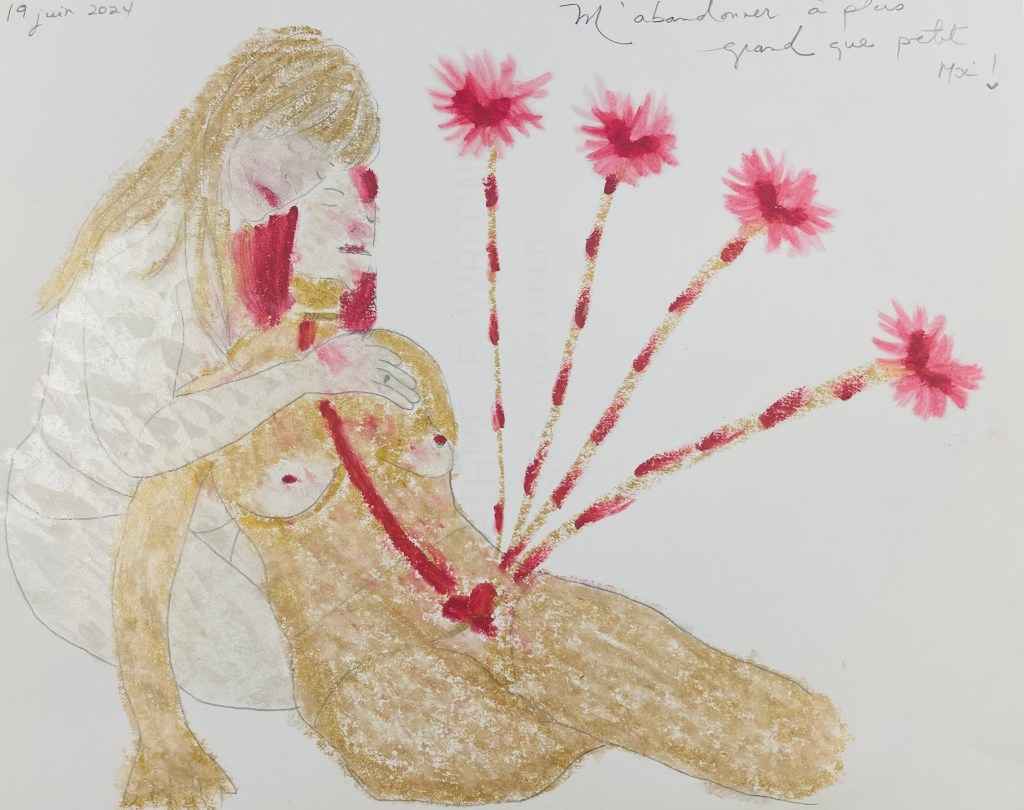 Je prends conscience que j’essaie de bien faire. Je veux que ce soit beau. Je sens que j’ai besoin de me conformer. Je veux choisir les « bonnes » couleurs et respecter les lignes. Mes mamelons sont rouge écarlate ainsi que mes lèvres. Je note que mon feu sacré est bien vivant. Je prends un moment pour descendre en moi, encore et encore.