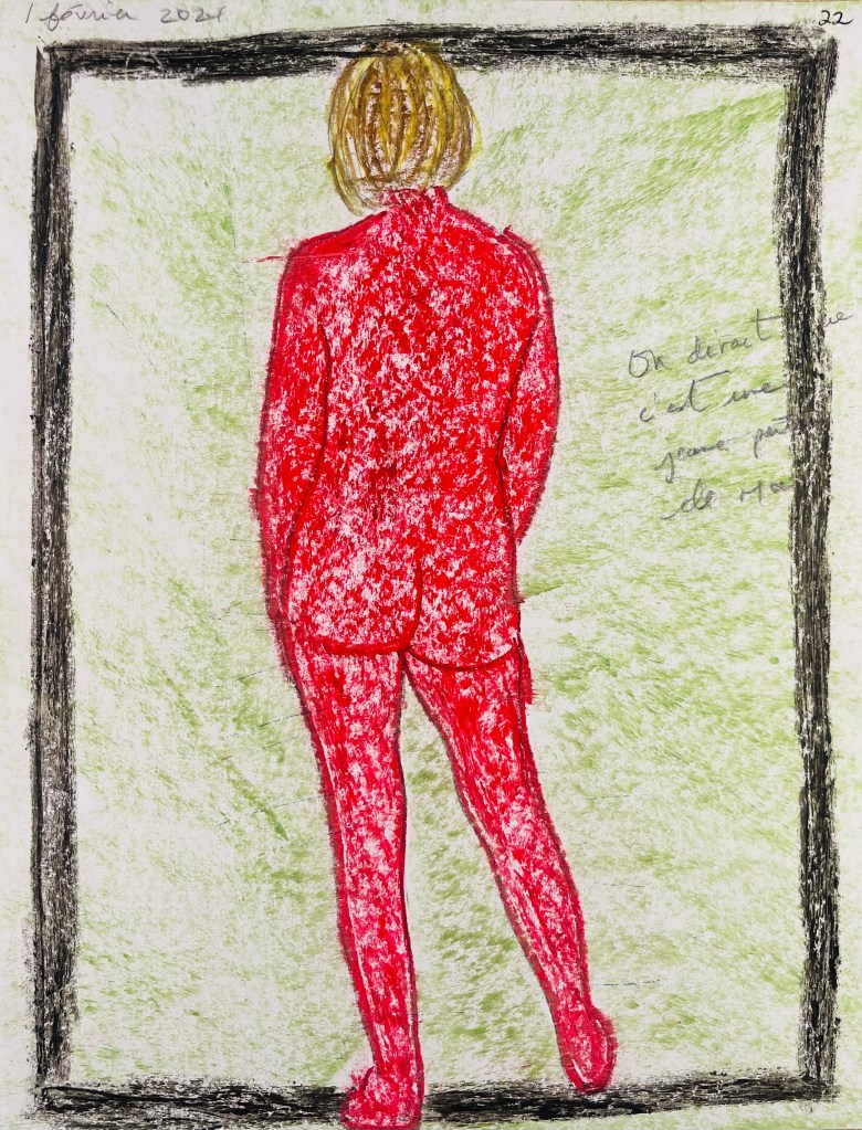 Une plus jeune partie de moi s’exprime. Ma vie est chargée sur mon dos. Je ressens du danger si je ne suis pas hyper vigilante, si je ne suis pas toujours aux aguets. C’est chargé par derrière, c’est intense. Tout mon passé y réside et tout l’inconnu se trouve devant. Comment puis-je avancer avec ce passé qui me pèse sur le dos et dans les jambes ? Je ne peux avancer. Je me sens figée par la peur. J’aimerais qu’elle se retourne. Je voudrais voir son visage, ses traits. Je ressens trop d’inconnu dans ce dos sans expression, c’est très inconfortable. Il y a trop de non-dits, trop d’incertitudes, trop de flou.