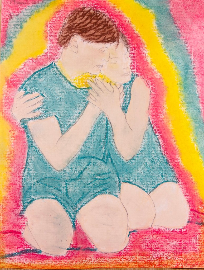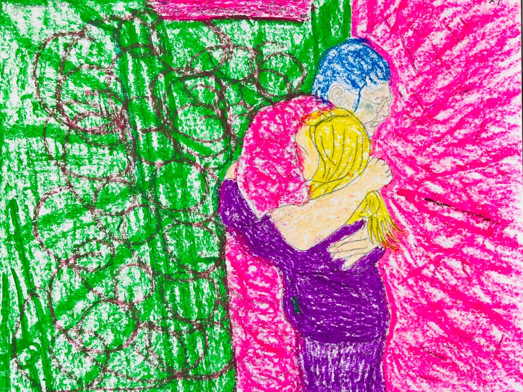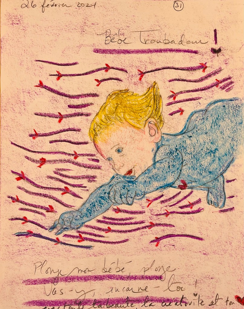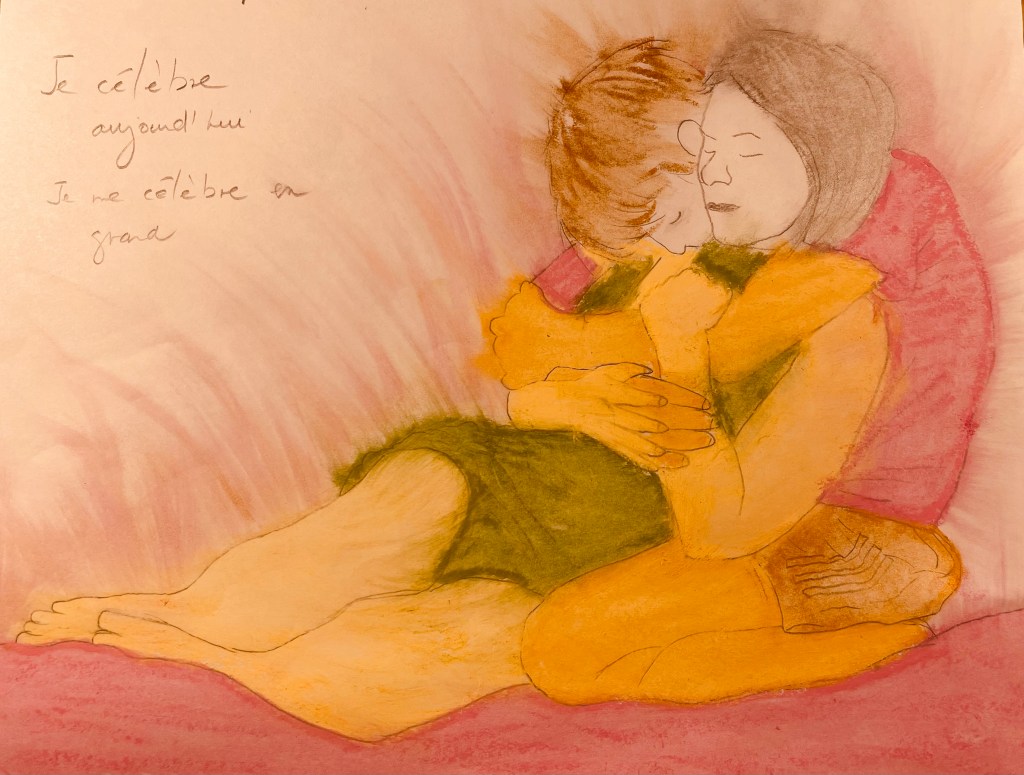 Je trace un petit enfant nu, sans défense, joyeux, accroché aux épaules de son papa : Simplicité, joie, pureté et émerveillement. J’ai pris grand plaisir à tracer tous les menus détails, les bulles me rappelaient la légèreté, la joie de vivre, le moment présent bien ancré. Ma connexion avec mon papa du ciel est de même : légère, joyeuse, enracinée, drôle, ouverte et profonde. Je suis tout cela moi aussi : colorée, aimante, énergique, puissante, douce, fofolle. Mon papa du ciel m’aime tel que je suis. Je n’ai pas à changer pour être autre chose, je peux simplement être. Quelle joie, quelle libération, merci, alléluia, amen.