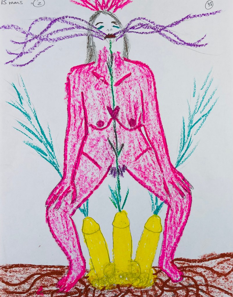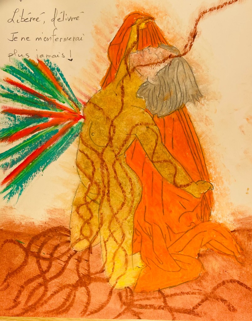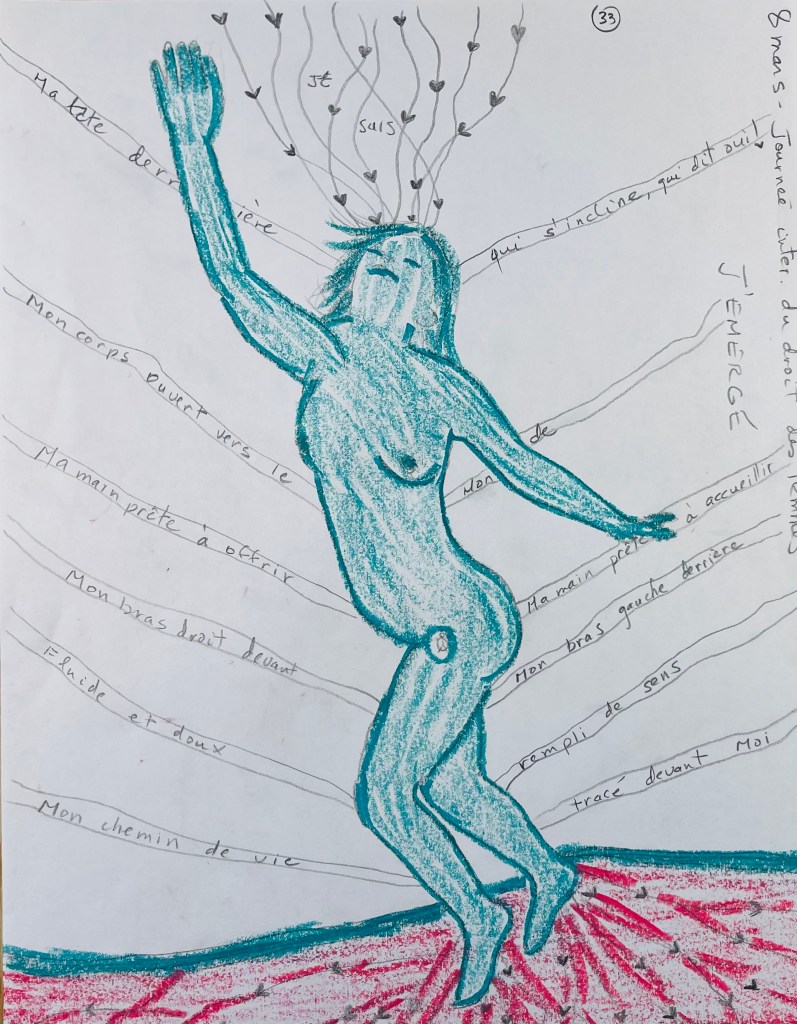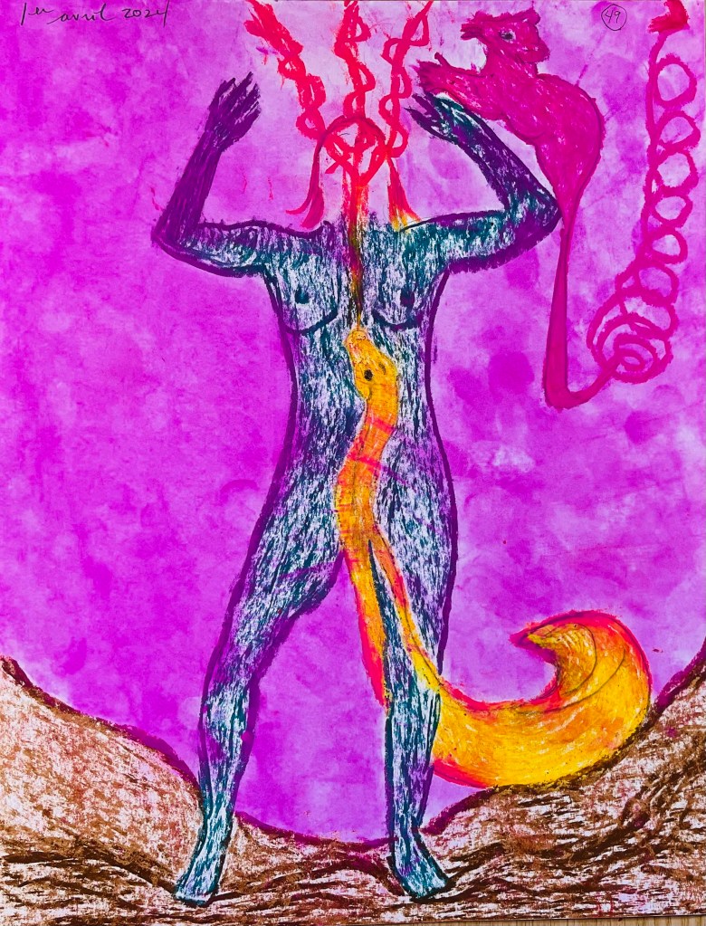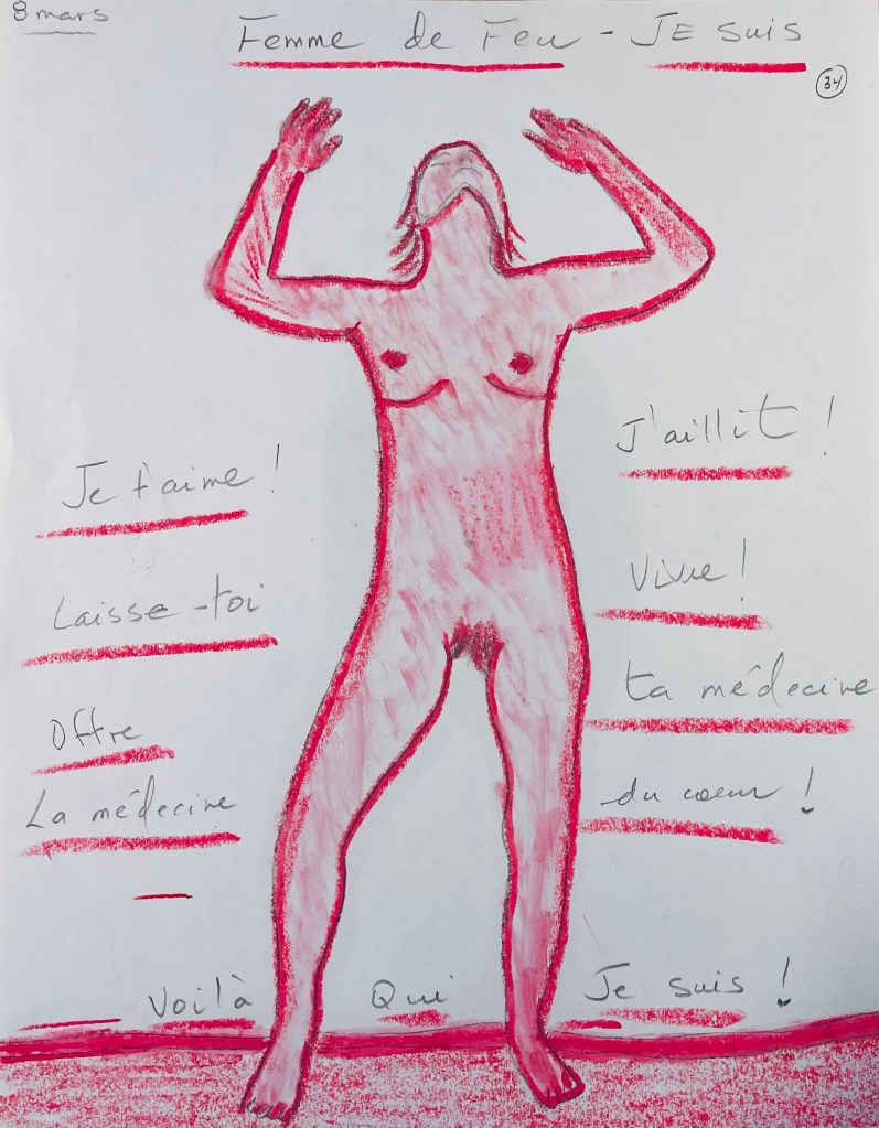 La femme que j’ai tracée est enracinée, vulnérable et ouverte. Elle se donne à la nature, la guérison est imminente. Elle est ouverte à la communication. Son feu sacré se lit à travers l’arbre vers le haut, créant une connexion ciel-terre. Elle est prête à s’offrir dans l’abandon total du féminin pour laisser passer le masculin. Je m’abandonne ainsi dans toute ma vulnérabilité à mon féminin sacré, je m’abandonne au plus grand que moi. La dualité cesse, je peux inclure le tout : ma spiritualité et ma féminité. Belle et grande dans toute ma beauté, je ressens la mort du paradigme féminin, la mort de sa perversion.