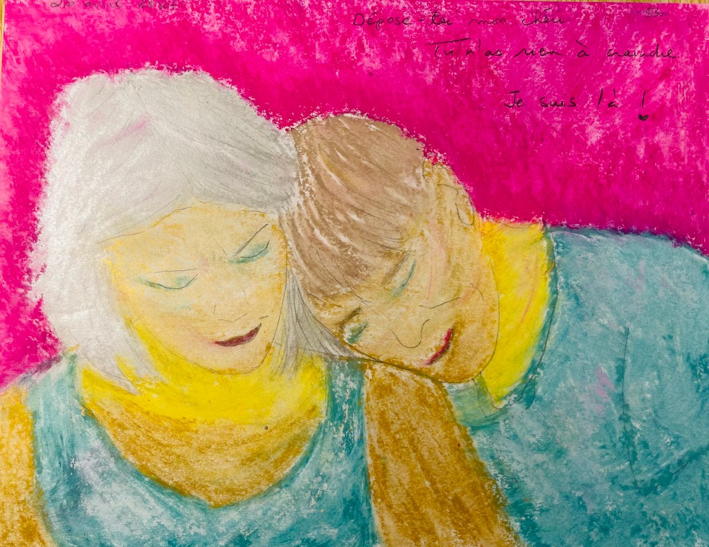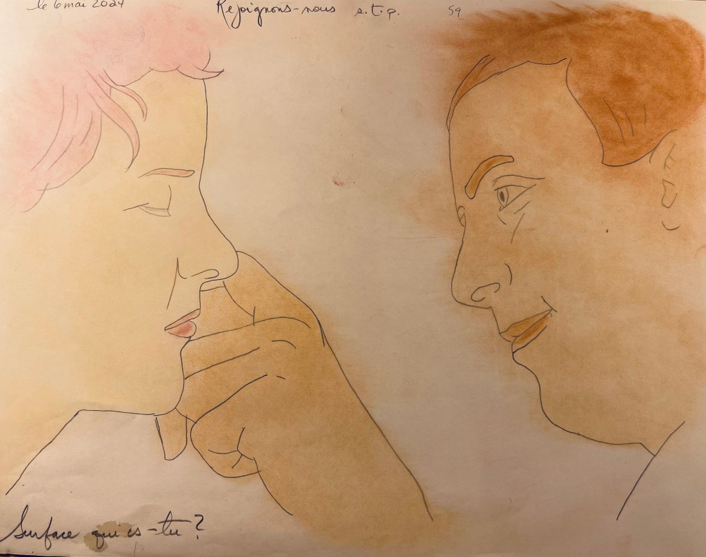 Eh bien, la vie m’a réservé une merveilleuse surprise ce soir-là. Alors que je m’apprêtais à tracer l’image choisie, je découvre devant moi, sur ma table lumineuse, deux visages et quatre mains. Comment est-ce possible? Émerveillée, je constate avec enchantement qu’une autre image s’était insérée « à mon insu » entre le tracé et le papier blanc. Un sourire illumine mes lèvres, et je commence mon dessin, touchée par une présence bienveillante derrière moi. Je peux me détendre; je suis entre « bonnes » mains !