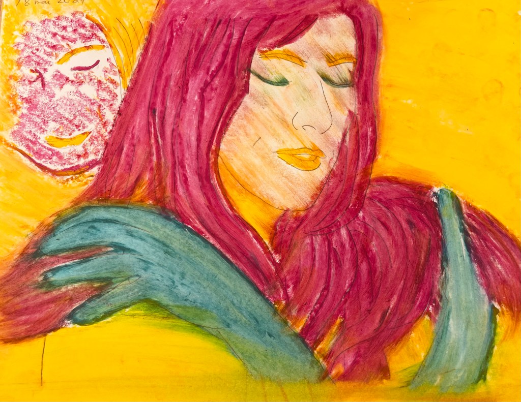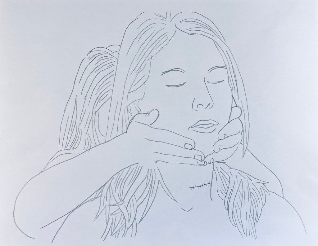 Ma fille se bat présentement contre un gros Goliath. Je voulais l’honorer par ce dessin. Je voulais honorer son visage pur et éclatant, son teint paradisiaque blanc comme neige. Je voulais l’honorer elle, pour le chemin qu’elle choisit d’emprunter. L’honorer pour sa beauté intérieure, pour sa détermination et pour le courage de son grand cœur.