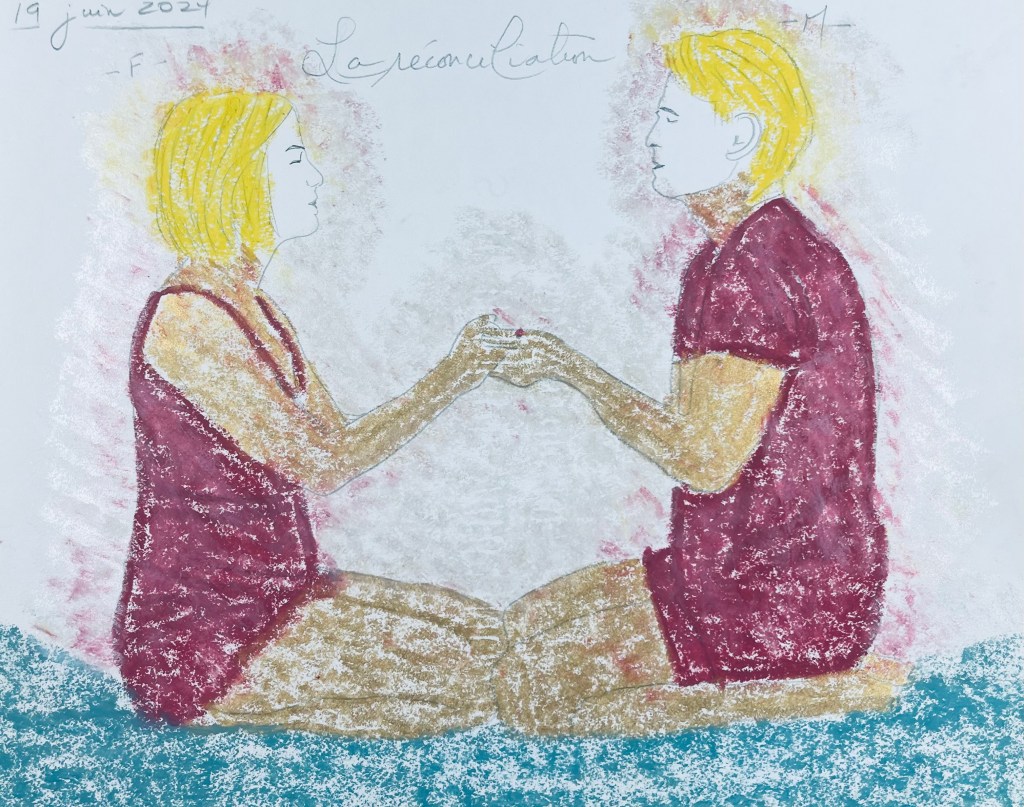 Mon papa du ciel m’étreint profondément. Je ressens la réconciliation du passé et l’amour, la présence du moment présent pour l’avenir. J’embrasse profondément mon papa du ciel et mon papa humain. Je ressens le sens profond de cette expérience, même si je ne comprends pas tout. Je n’ai pas besoin de tout comprendre, je ressens et c’est suffisant. J’embrasse mon passé avec cœur et libère les ressentiments. Le violet m’accompagne, me purifie, me nettoie. Je me blottis dans ses bras, je peux lâcher prise et lui faire confiance. Ma foi est de retour. C’est doux, moelleux dans ses bras. Je ressens la douceur, la patience, l’amour de mon papa du ciel et je ressens aussi que mon papa humain a fait de son mieux avec ce qu’il avait. Tout est parfait dans cette étreinte. J’embrasse la vie qui coule en moi, j’embrasse toutes les parties de moi sans exception, sans divisions. Tout y est ! Je m’enracine à la terre avec lui, mon papa du ciel est beau et doux. Il aime, sans condition.